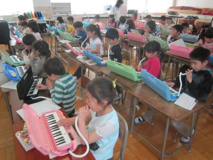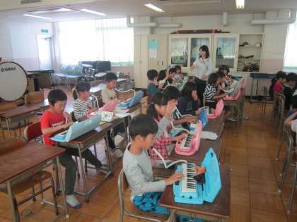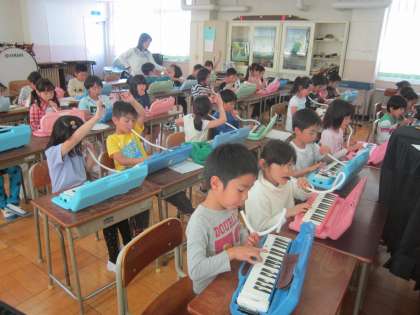 2年音楽科「黄色のリボン」 鍵盤ハーモニカの練習をして、一人一人先生に音を確認してもらっていました。