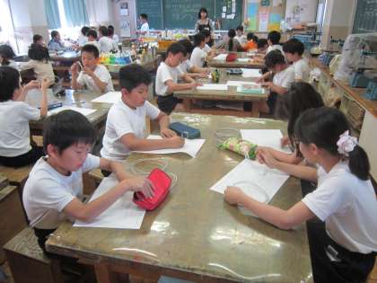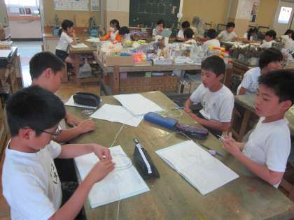 5年図画工作科「ステキなハリガネタワー」 針金の曲げ方、巻き方、つなげ方を工夫して、針金のタワーを作ります。完成予想図を描いてから、針金を工夫して曲げ始めました。