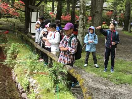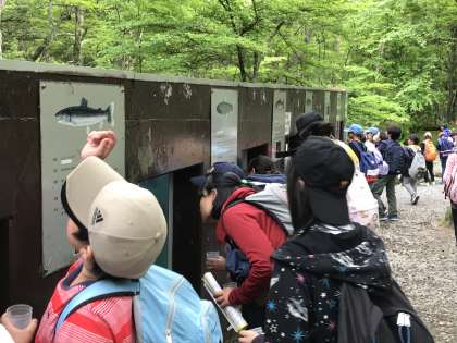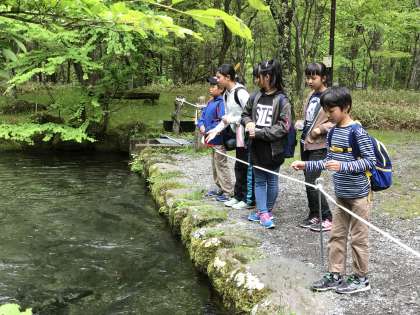 さかなと森の観察園で、ニジマスなどにえさをあげたり観察したりしました。