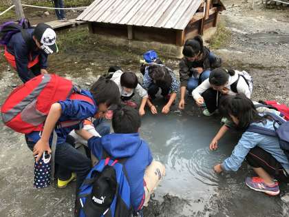 三本松で男体山をバックに記念撮影、そして源泉の見学です。10円玉を