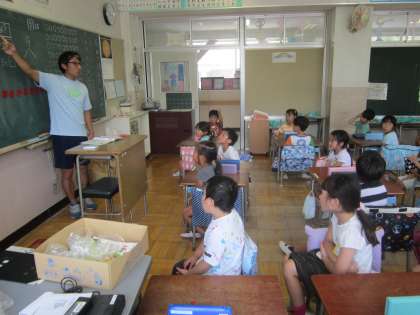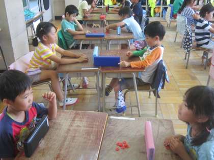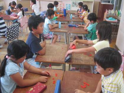 1年算数科「いくつといくつ」 あといくつで9になるかな?おはじきを使って、友達と問題を出し合います。やり取りしながら楽しく学習していました。