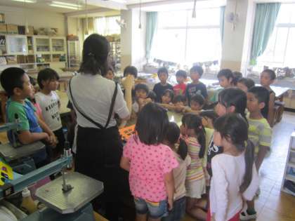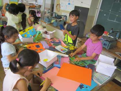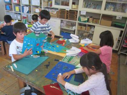 2年図画工作科「まどを開いて」 カッターで窓のある素敵なまちなみを作ります。建物の形ができて、窓の装飾を工夫していました。