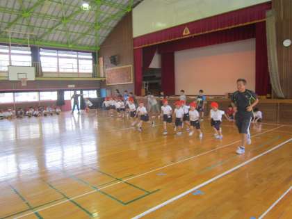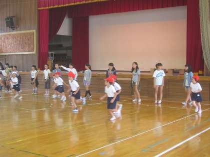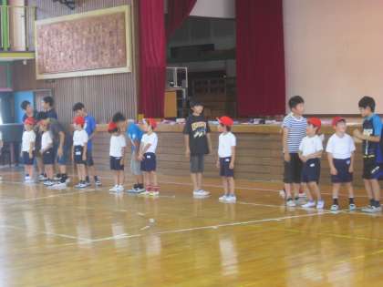 1年・6年「体力テスト」 1年生のシャトルランを6年生が手伝って、教えてあげたり、計時したりしました。1年生も頑張っていました。