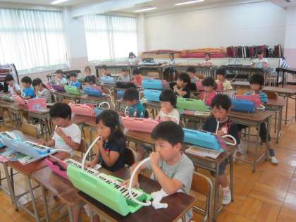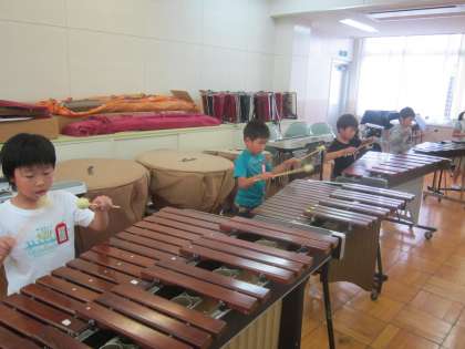 1年音楽科「もぐりっちょ」 鍵盤ハーモニカと木琴で演奏のリレーを楽しんでいました。