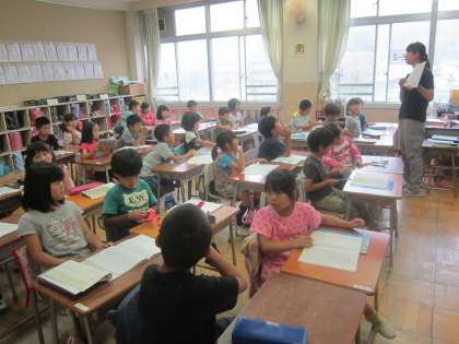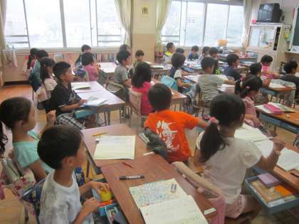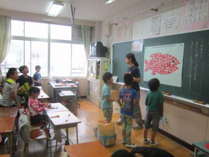 2年国語科「スイミー」 大きななった時のスイミーの気持ちを考え、クラスみんなで実際に大きな魚のスイミーを作りました。