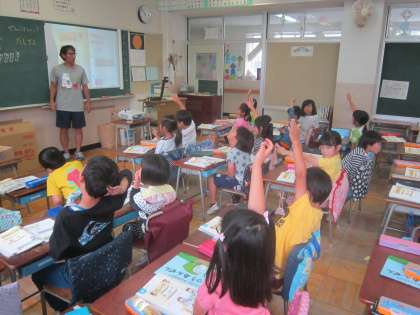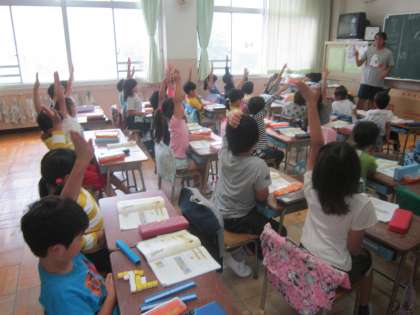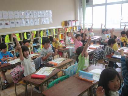 1年算数科「あわせていくつ」 お話をたし算の式にします。話し合いながら楽しく学習していました。