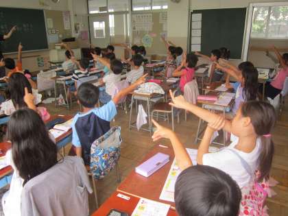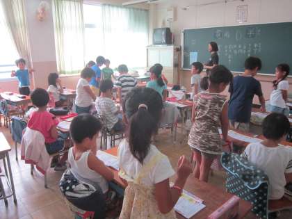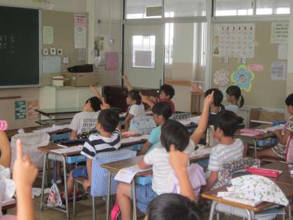 2年国語科「どうぶつえんのじゅうい」 新出漢字『半』『電』の書き方の練習をして、新出漢字を使った熟語の情報交換をしていました。