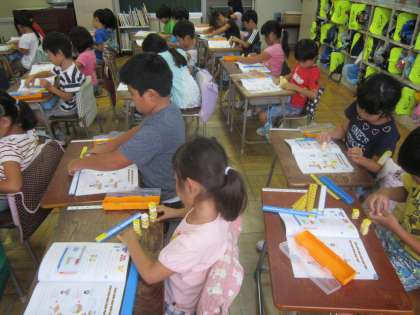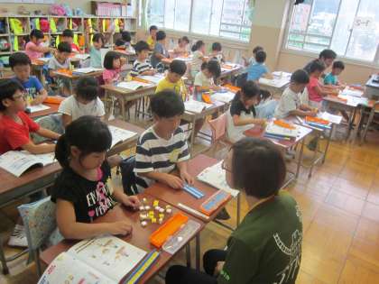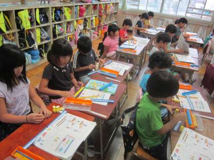 1年算数科「どちらがおおい」 今日は、ブロックを積んでどちらが高いか調べる学習をしていました。