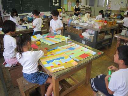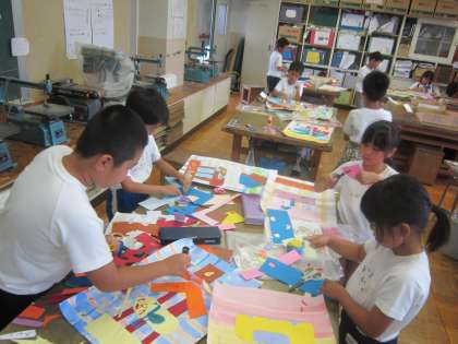 2年図画工作科「デコレーションケーキ」 画用紙の色と形を組み合わせてケーキを作ります。美味しそうなケーキが完成間近です。