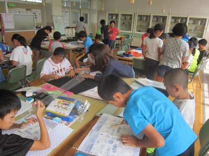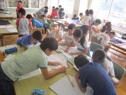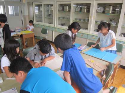 5年家庭科「ミシンにトライ」 ナップザックかウオールポケットに挑戦です。今日は、布を裁っていました。