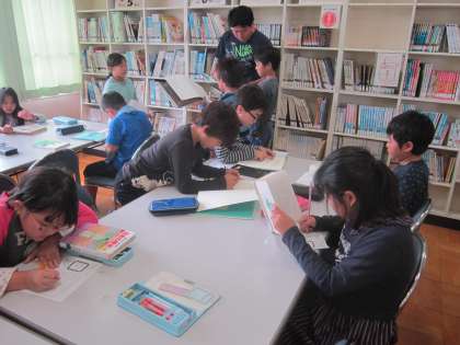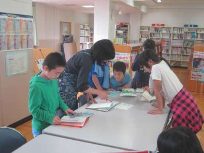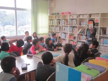 4年読書活動 図書館司書の先生から、分類記号からのほんの探し方を教わり、自分がもらった分類記号の本を探して読んでいました。