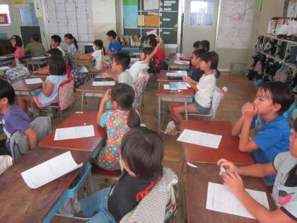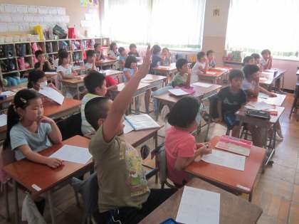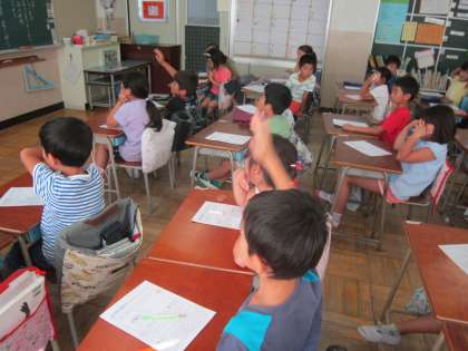 2年生活科「うごくおもちゃを作ろう」 ゴムで動くおもちゃをパワーアップさせるには?クラスで話し合っていました。