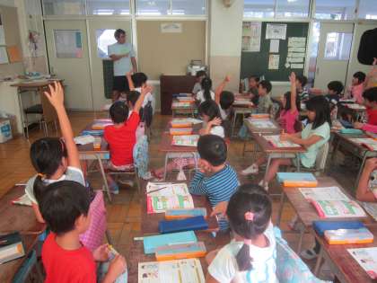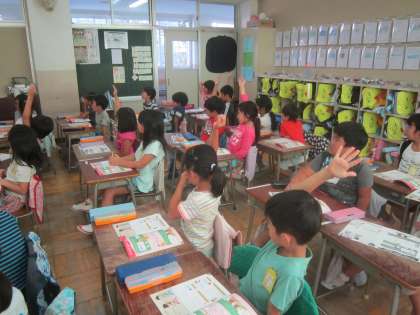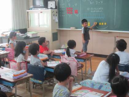 1年算数科「たし算」 9+4 繰り上がりの計算の仕方について、話し合いながら学習していました。
