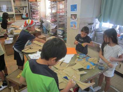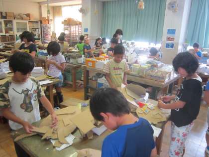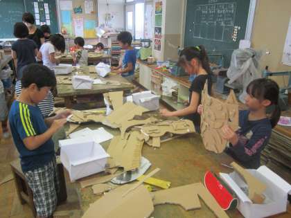 3年図画工作科「プリプリプリミティブ」 ダンボールで工夫しながら、お面を作っていました。