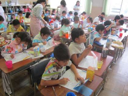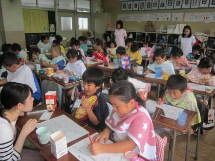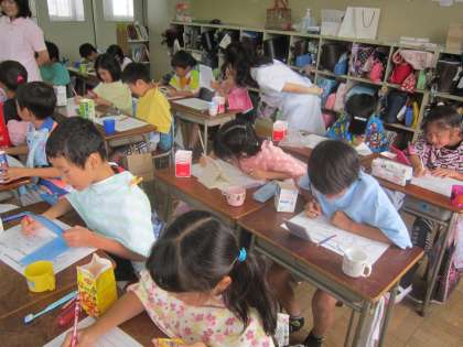 3年保健指導「歯みがき指導」 学校医の歯医者さんから、歯磨きや虫歯の予防についてご指導いただきました。染色薬を使って、歯磨きチェックをして、磨き残しがないようにする体験もしました。ありがとうございました。