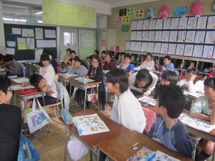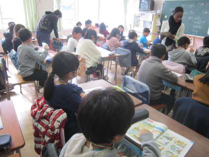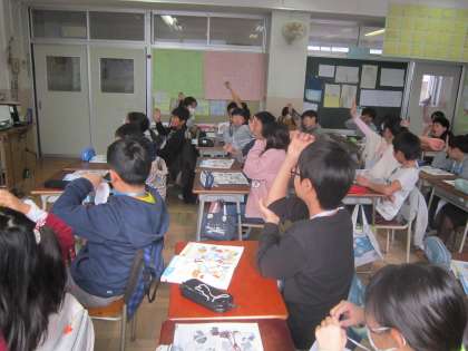 5年外国語活動「What is this?」 教科書の挿絵の物の名まえやaとanの使い方を学習していました。
