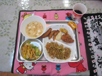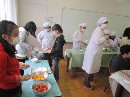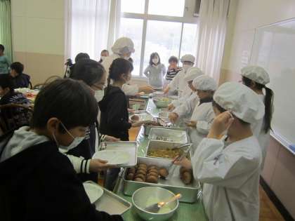 4年2組がバイキング給食でした。主食、主菜、副菜を上手に選んで、バランスよく配膳し、美味しくいただきました。