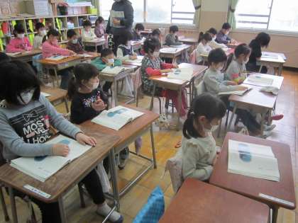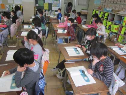 1年国語科「たぬきの糸車」 初めての物語、CDで朗読を聴いて、どんなお話なのかつかみました。