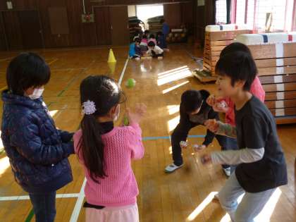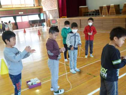 1・2年生(1組グループ)活科「むかし遊び」 2年生が学習してきた昔遊びを1年生に伝える交流会をしていました。やさしく上手に教えたり、先輩のお話をしっかり聞いたり、よい交流ができました。