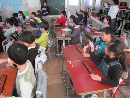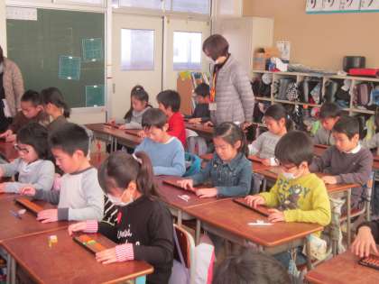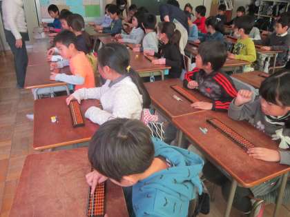 3年算数科「そろばん」 地域の珠算の先生を講師に招いて、そろばんの学習をしました。今日は、基本的な操作について練習しました。