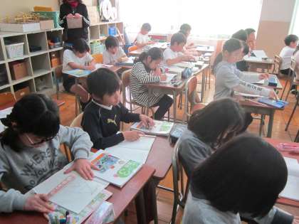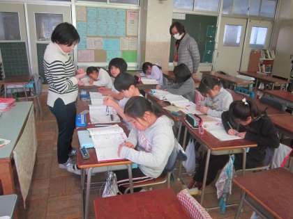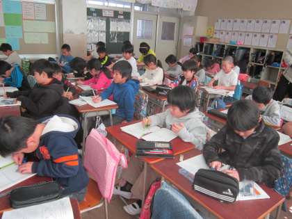 3年算数科「三角形」 2学級3展開習熟度別の授業です。正三角形や二等辺三角形をコンパスと定規を使って丁寧に作図していました。