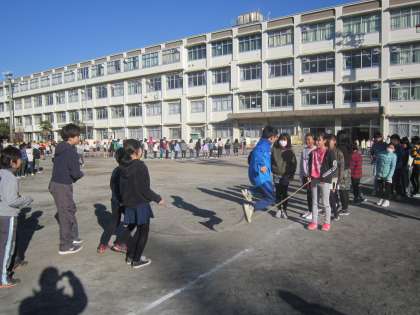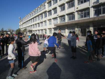 今朝は、全校で長縄集会でした。3分間で何回連続跳びができるか?クラスごとに一生懸命に取り組んでいました。