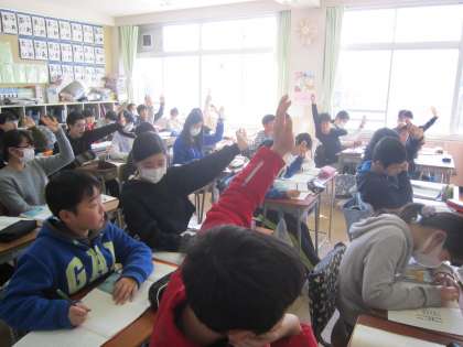 6年国語科「海の命」 あらすじをつかみ、父の人柄が分かるところを見つけて、「どんな人柄か?」「太一は父をどう思っていたか?」話し合いました。