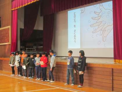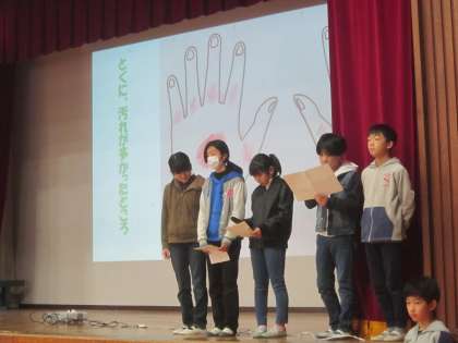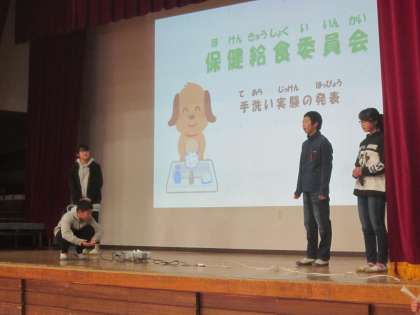 今朝は、保健給食委員会の集会がありました。手洗い大切さや仕方についての説明や元気度チェッククイズ等、充実した内容の集会でした。