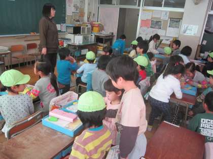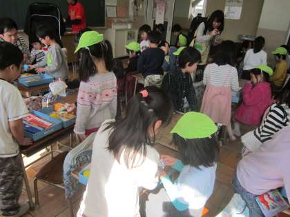 打越保育園の年長さんが小学校に来て、交流会をしました。机に座ってもらって、一人一人に1年生がついて、学習道具を紹介したり、ランドセルをしょってもらったりしました。校舎の中を見学して、体育館で365日の紙飛行機の合唱をプレゼントしました。緊張気味に来校した園児も、次第に笑顔で楽しそうに交流していました。
