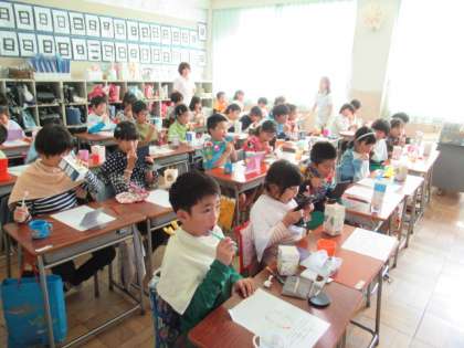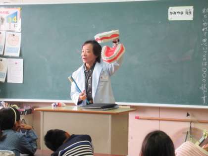 保健指導の一環として、3年生を対象に、歯科校医の神山先生による歯磨き指導が行われました。授業の前半では、虫歯の原因のお話や模型を活用した歯磨きの仕方などを丁寧に教えていただきました。授業の後半では、歯垢の染め出しを行い、教えていただいた歯磨き方法で丁寧に歯磨きをしました。これからも、教えていただいた歯磨き方法で健康な歯を保てるように頑張りましょう。
