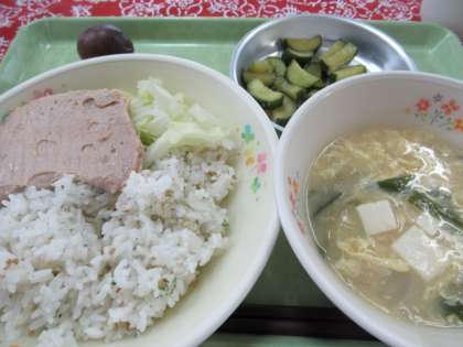 主食(黄色)・副菜(緑色)・主菜(赤色)・乳製品(紫色)・果物(水色)と