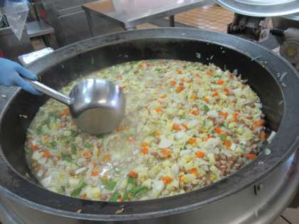 牛肉や羊肉を使って作りますが、給食では豚肉を使います。
