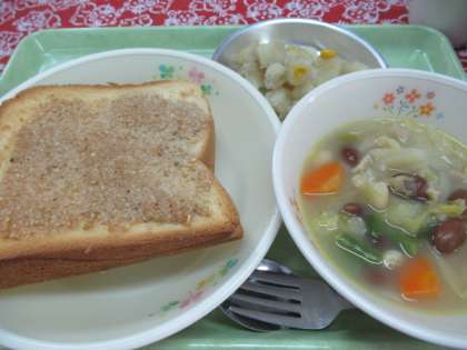 今日の給食は『やさいとまめのカレースープに』をいただきました。