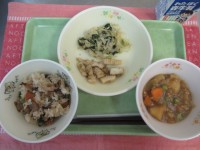 カレーピラフ ポテトのカルボナーラ キャベツのスープ くだもの ぎゅうにゅう