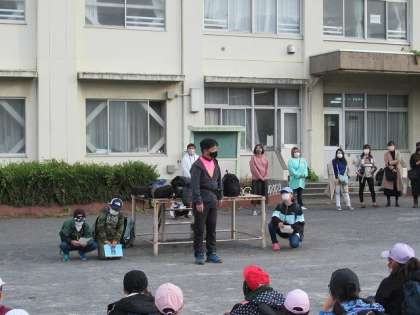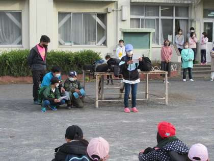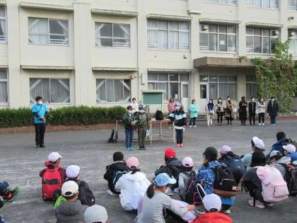 晴天の中、校庭で出発式を行いました。緊急事態宣言に伴い、2回の延期がありましたが、子供たちは元気に姫木平へ出発しました。