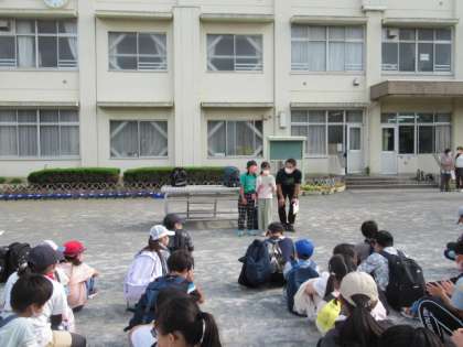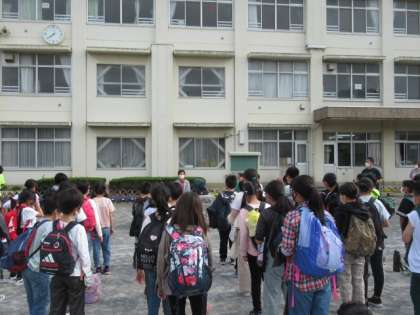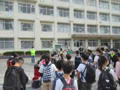 朝、荷物を置いて子供たちは班長を中心に行動班で並び出発式を行いました。
