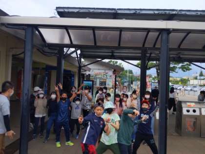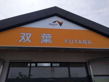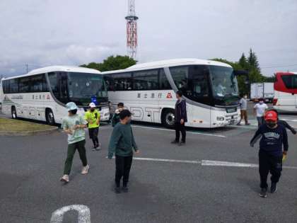 双葉サービスエリアでトイレ休憩です。バスの中では、バスレクで盛り上がってます。