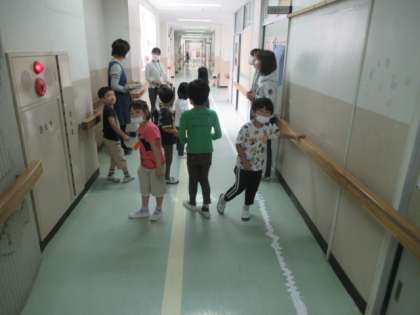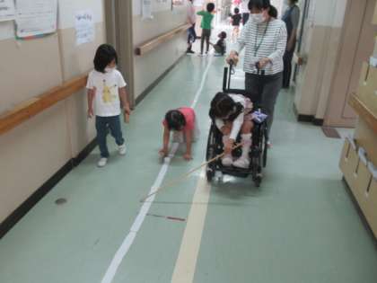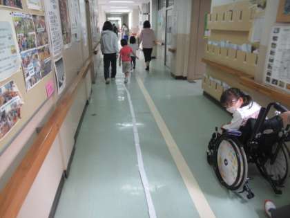 図工の時間、はさみの練習をするために切った「細長い紙」をつなぎ合わせました。いろいろな形があり、ひまわり学級から職員室まで、長く伸びていました。最後にその上に列車を走らせました。