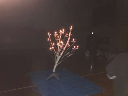 雨のため、キャンプファイヤーではなく、体育館でキャンドルファイヤーを行いました。ロウソクの火が、とても綺麗です。内容は、キャンプファイヤーと全く同じゲームやダンスを楽しみました。