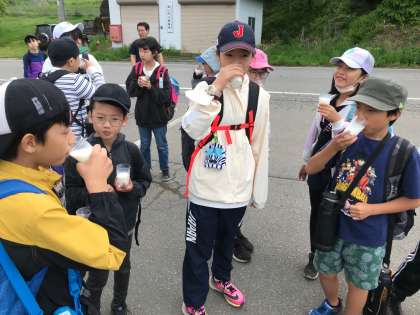 乳搾りの後、朝搾った牛乳をいただきました。少し甘くて、美味しかったです。