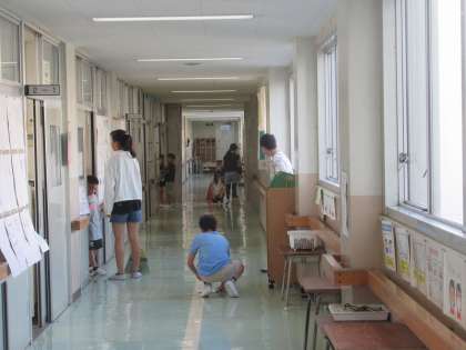 1年生の教室の前で、6年生の子供たちがあいさつをしています。