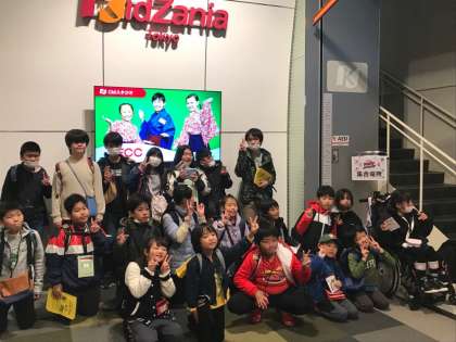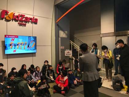 キッザニアに到着しました。記念撮影をしてから、係の方の説明を聞きます。