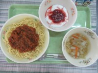 スパゲティミートソースはくさいのスープヨーグルトのいちごソースがけぎゅうにゅう画...