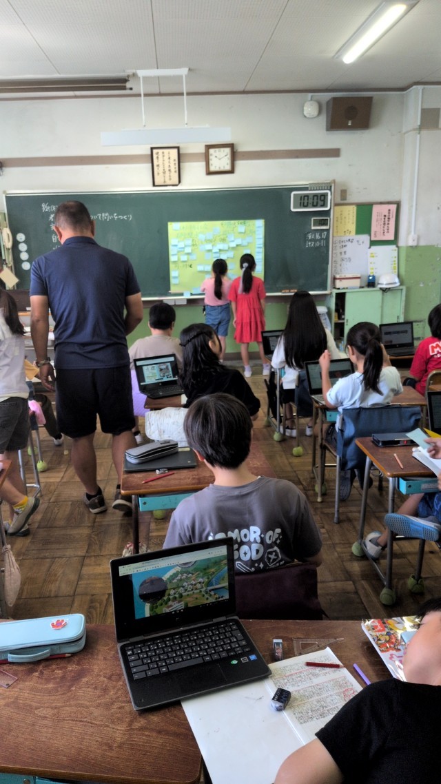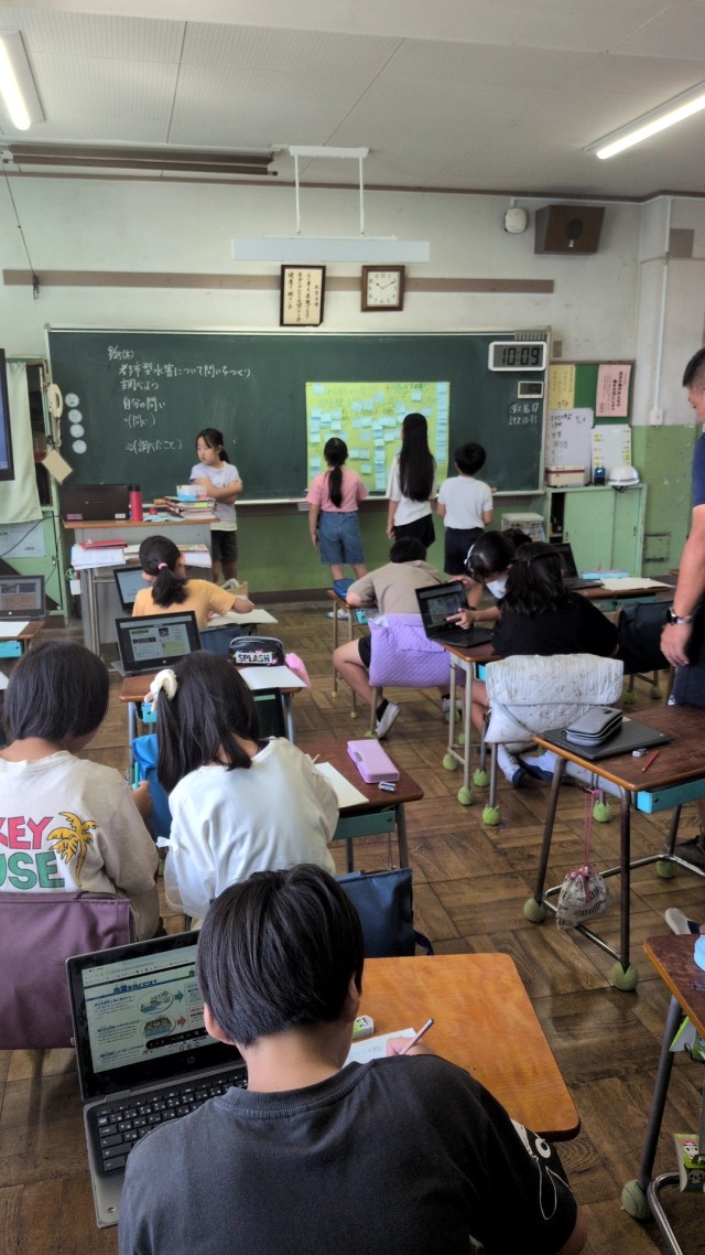 都市型水害について資料映像をみて、「自分なりの問い」を考えます。「なぜマンホールから水が逆流するのか?」「交通への影響は?」次は「予想」をたて、探求学習を進めます。
