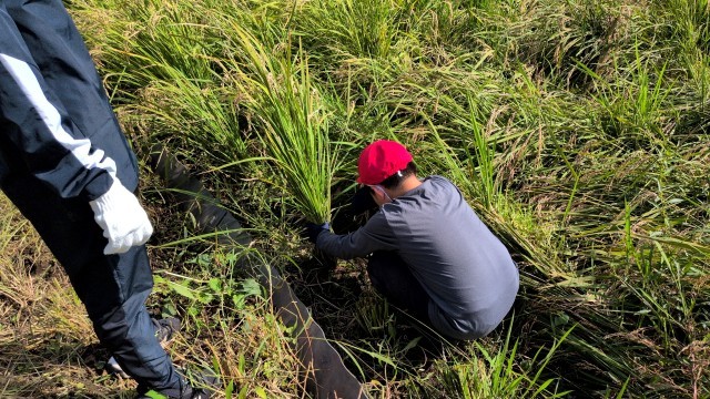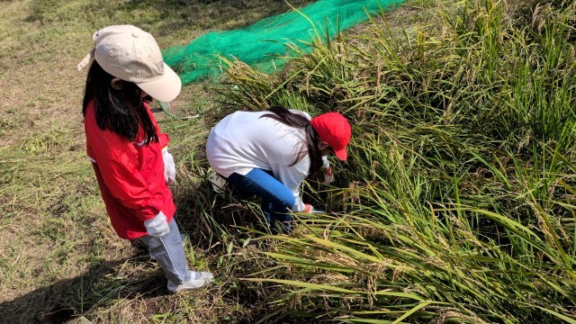 稲刈りです。「農家の方の 苦労が分かる」子どもの感想です