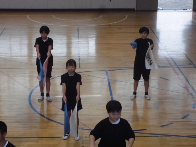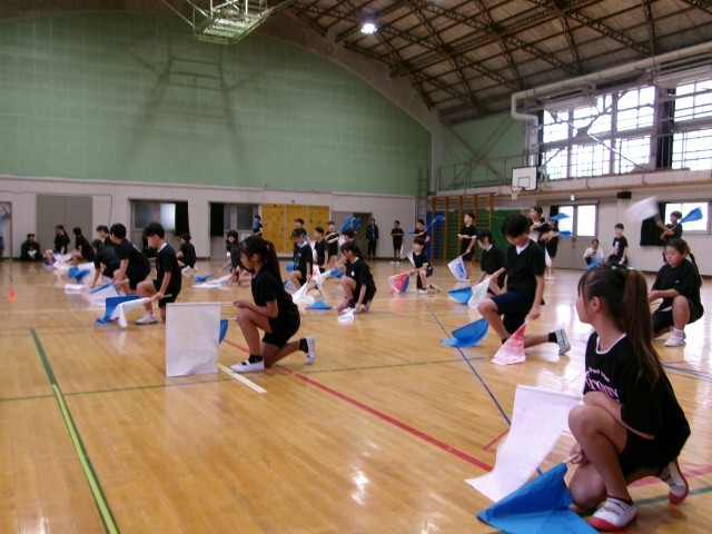 右手に青旗を持ち、左手には個性豊かに色付けをした白旗を持って