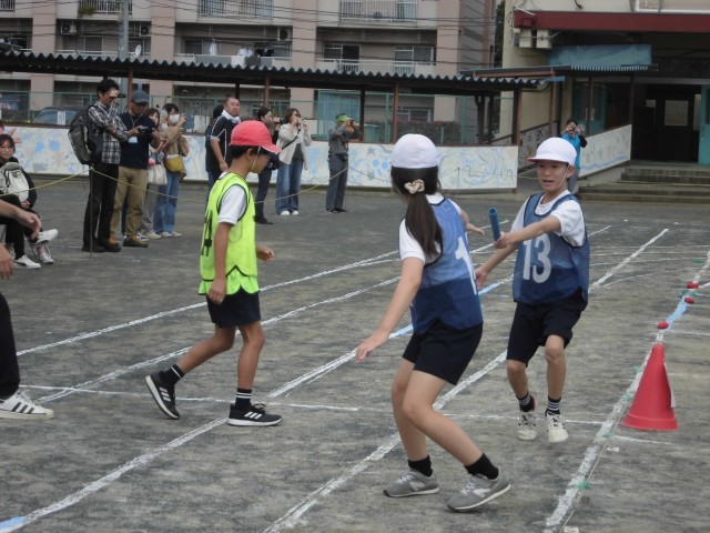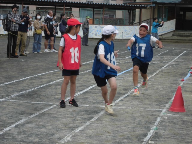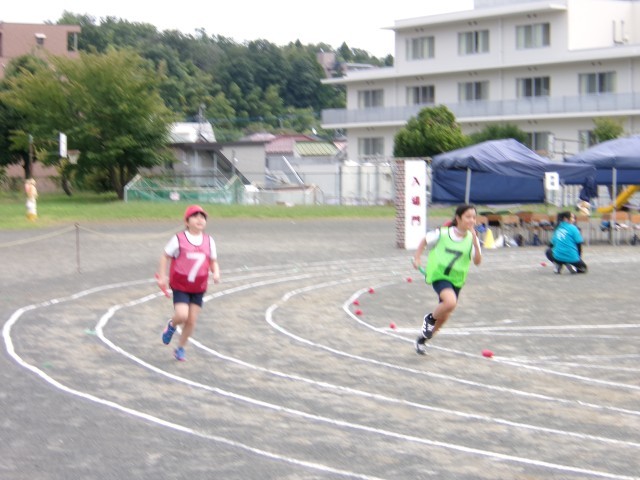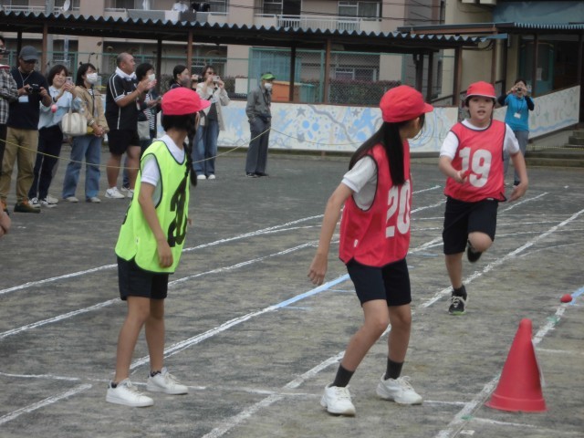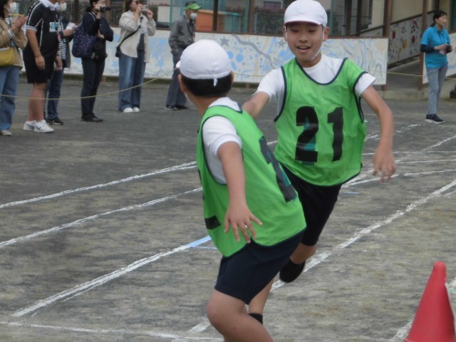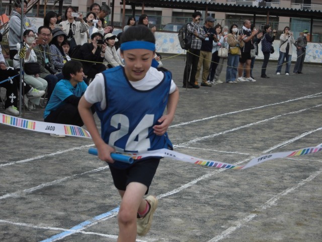 中高学年のリレー、みんな一生懸命バトンをつないでいました。