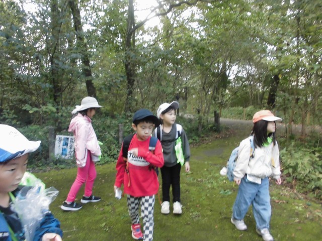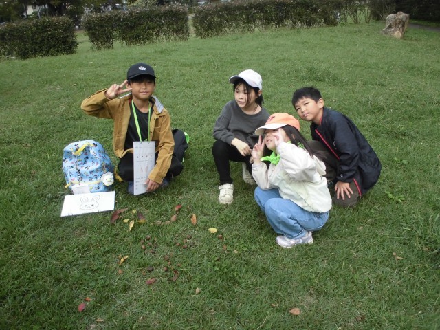 清水公園に行き、秋探しをしました。色とりどりの落ち葉や、どんぐりを拾いました。
