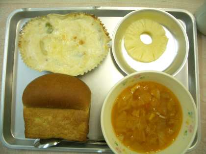 今日は洋食メニューの日♪ほうれんそうが入った食パンと、大人気の給食室