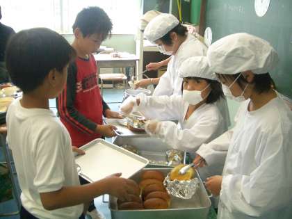 写真は、あさひ学級の配膳の様子です。協力しあって和やかに進めていまし